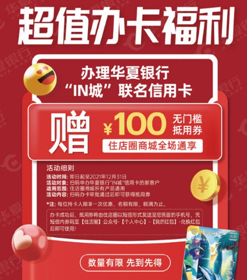 同時(shí)辦理華夏銀行“IN城”聯(lián)名信用卡,還贈住店圈全場通用100元無門檻抵用券,超值福利火熱來襲。
